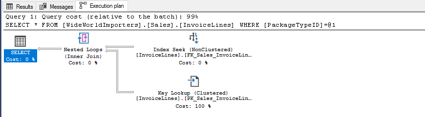 If we check the table [Sales].[InvoiceLines] we can observe there is a non clustered index on [PackageTypeID] so we expect that queries using this column to filter the results, will benefit from it. Just like this